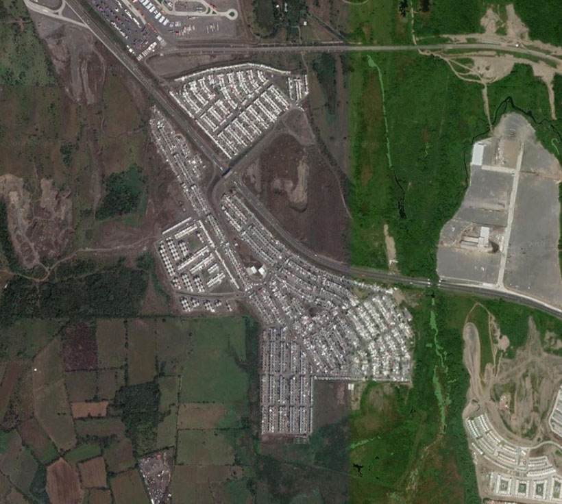 Housing at Colinas de Santa Fe is part of the larger housing campaign started in 2001 promoted by Mexican government to extend home ownership for low income groups. It is the largest housing construction program in Latin America’s history. The governmental strategy was simple: build quickly, sell cheaply, and finance them with low interest loans. However, due to the poor construction quality and remote location, many of the housing projects are only partially inhabited, abandoned, or never inhabited.
