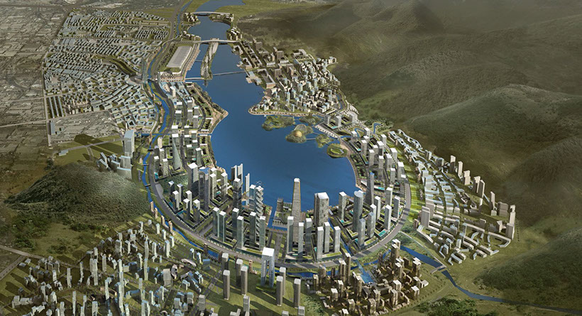 As the population crisis in China rise to new heights, cities expand ever outwards to accommodate for the explosive urban population. As a new effort to build ‘sustainable’ spaces, China commissioned a series of new projects that were designed to be eco-friendly and low-carbon dependent. Meixi Lake City is such a project. Designed by KPF, this large new district near Changsha is touted as one of the most sustainable cities in China after completion. KPF describes the project as follows, “Water is the primary element of design, and act as the heart and center of the master plan. A 40 hectare lake is the “central park” of the city, providing transportation and space for gardens and cultural events. Linked with a series of radial canals are eight neighborhood clusters that house 10,000 people each. Transportation by boat is highly prevalent, reducing the need for automobiles and pollution.